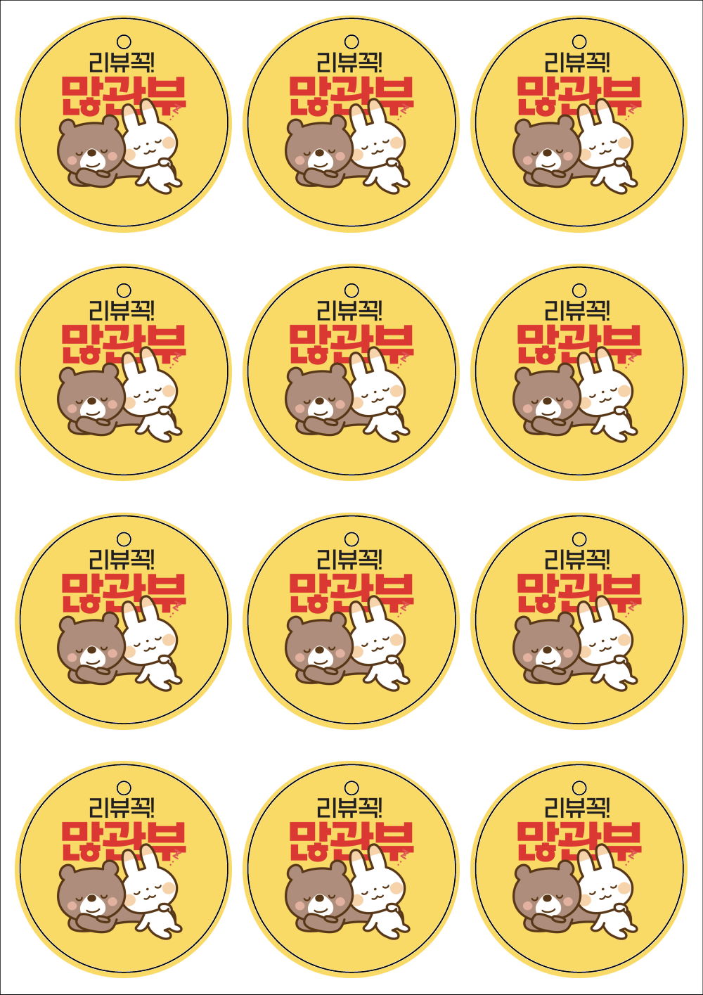 출력용 A4 디자인 택, 규격코드: TLH0121, 디자인코드: FA024(리뷰꼭! 많관부(yellow bg)), Φ62 (mm)
